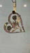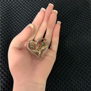 Charming vintage brooch featuring a heart-shaped gold-tone frame adorned with pink rhinestones. Inside, two blooming flowers and a delicate butterfly create a romantic garden scene.