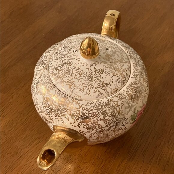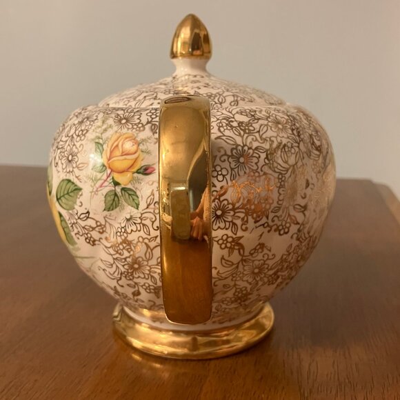 Beautiful gold chintz pattern teapot with yellow + pink roses