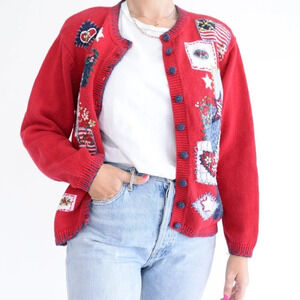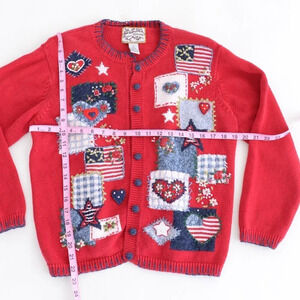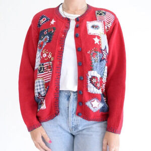 Get ready to stand out during these chilly months with this vintage Heirloom Collectibles Flag Hearts Knit Cartigan.