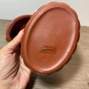 This vintage hen on basket pottery container features a charming chicken shape with a warm brown glaze inside. Perfect for farmhouse or country-style kitchens, it can be used for storage or simply as a decorative accent. Its rustic appeal makes it a lovely addition to any collection or countertop display.