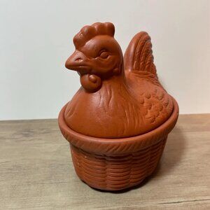 Vintage Hen on Basket Nest Pottery Container Brown Glaze Inside Chicken Dish