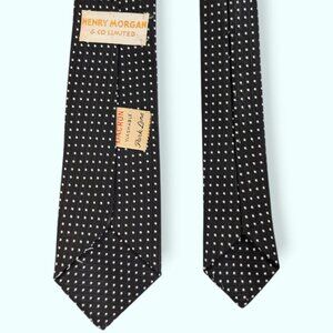 This vintage tie by Henry Morgan & Co Ltd is made of 100% Dacron polyester and is black with very small white polka dots. The interior of the tie is made of the same fabric as the exterior. The ends are fairly similar in width but can still be identified correctly. The thicker end has a vertical tag on the back listing material content (that also says Park Lane?), and a maker's tag stitched horizontally above it, through which you can secure the thin end. The tie has normal vintage wear, but no issues that would affect wearability.
