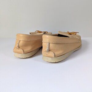 Vintage Hiawatha By Bastien men's leather moccasins. These are the Yahonwa' (boat) model, inspired by the famous boat shoe. Made in Canada, hand-laced moccasins. Cream colour cow leather. Rubber sole molded in Canada.