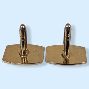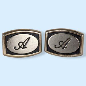 These vintage cufflinks by Hickock are made of a gold tone metal and have toggle backs. The tops of the cufflinks are rounded rectangles with a black capital "A" in a gold oval with a black background. Both cufflinks are stamped Hickok inside one post, and USA inside the other. There is normal wear throughout, but no issues with wearability.