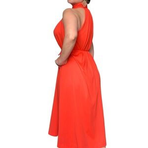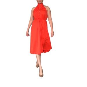 Vintage halter dress, high neck maxi dress, gold button detail dress, orange summer dress, resort wear, beach wedding guest dress, cocktail party dress, boho chic dress, retro evening dress, statement vintage piece, adjustable waist dress, bold color dress, vacation outfit, elegant halter maxi.