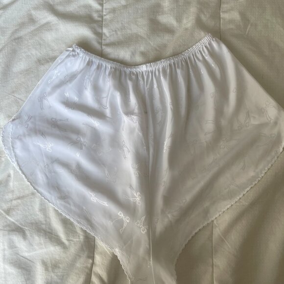 These are so cute! Shown styled with an oversized tee. Love the shiny bow motifs, the trim details, and high cut sides. Super stretchy, fits size S-M.