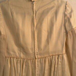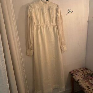 Ethereal vintage wedding gown in soft ivory with timeless Victorian-inspired details. Features a high neckline, sheer long sleeves, and delicate floral embroidery on the bodice and cuffs. Flowy A-line silhouette with a modest yet romantic feel. A rare piece perfect for vintage-loving brides or styled shoots. Likely handmade or custom from the 60s/70s. In beautiful condition for its age.