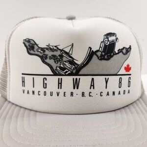 This hat represents an art installation called Highway 86 that was on display at the Vancouver Expo 86 fair. Excellent condition for age, adjustable, an original rarity!