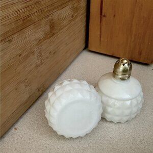 Vintage Hobnail White Milk Glass Salt & Pepper Shakers Made in Japan Gold Topped