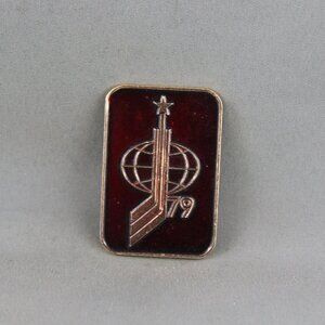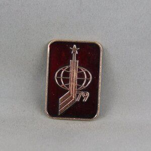 Up for sale is a vintage hockey pin. The pin has a red base colour and the 1979 World Hockey Championships is stamped pin. The event was held in Moscow USSR. What a great addition to any pin collection.