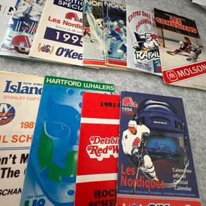 Collection of vintage hockey programs featuring various teams. Perfect for sports memorabilia enthusiasts.