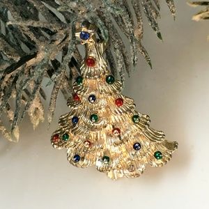 Vintage Brooch Textured Gold Tone with red, blue and green ornaments. Some wear on a few balls. Blue rhinestone star on top of tree. Marked GERRY'S.