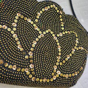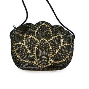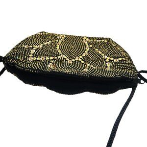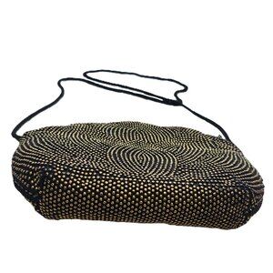 Vintage 1970's Gold beaded black bag by Holiday Fair(Jet Bag). In really great condition for these mini bead style retro bags, there are a couple beads missing on the edges and one sequin is trying to come loose but still attached(easy fix). 8.5 inches wide by 6.5 inches tall aprox. Interior is complete and clean but wrinkled. This bag has been very well taken care of and preloved.