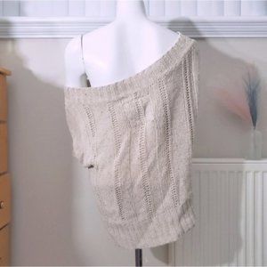 A beautiful off the shoulder cable Knit short sleeved sweater, with a georgous sandy beige tone. A rare find!