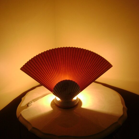 This vintage table lamp boasts a stunning Hollywood Regency style with a pink accordion fan design and a pretty white shell with flowers, feature at the bottom. Gold accent color on bottom base and both side edges of fan. It has a Off/On switch on the cord. Works perfectly - takes a chandelier bulb which is included. Slightly dusty - can be wiped down with a damp cloth, I will leave that to the new owner. Little bit of yellowing at the base from manufacturing adhesive, but not too noticeable. A charming addition to any space.