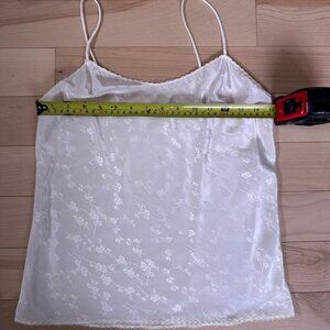 Elegant vintage satin cami by Linda Lingerie for Holt Renfrew, made in Montréal. Soft ivory tone with subtle floral jacquard pattern and delicate lace trim. Lightweight, silky feel and adjustable straps. A timeless piece that can be styled as lingerie or a chic layering top.