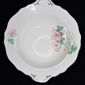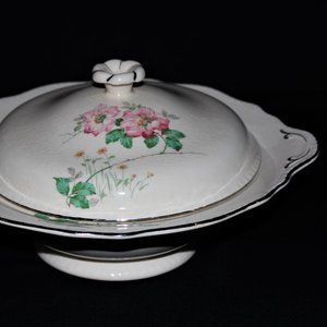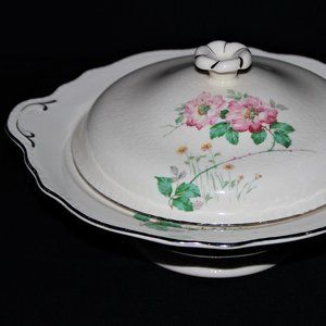 A pretty serving bowl that would add charm and elegance to your dining table. Made by Homer Laughlin, Irene features colorful flowers, branches and leaves. The bowl has a scalloped rim with platinum trim, and subtle ribbing on the foot. The backstamp dates this piece to 1931. It's in very good condition without chips or cracks. There is some very light crazing on the lid and the lip of the bowl where the lid rests.