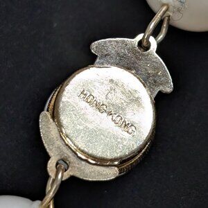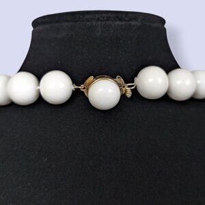 This vintage necklace comes to us from the 1950s to 1970s. It is beaded and has a (round) box closure made of a silver tone metal that is stamped HONG KONG on the underside. The beads are white, slightly large, and spherical with a glossy, even surface. They glow a bright blue under UV light and don't have any visible mold lines. These characteristics, plus the weight and stamp, point to lucite as the material used. The necklace has some wear, including a yellowing of the metal (though it is already gold tone) and some gentle marks in the clasp and beads. There are no issues affecting wearability.