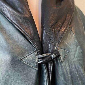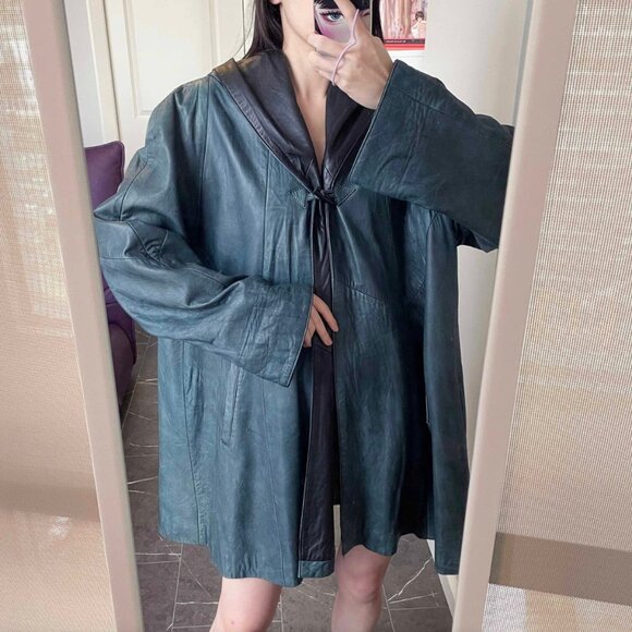 Vintage Hooded Green Leather Poncho: Oversized 90s Cape Coat (3XL)
