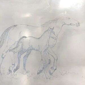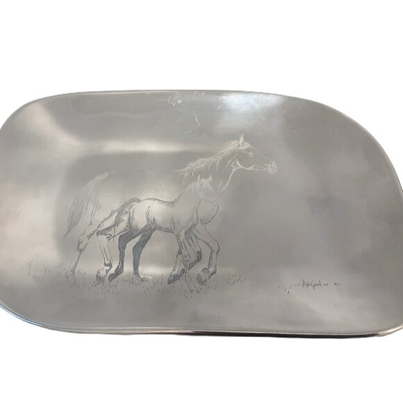 Vintage oblong aluminum tray by Hoselton Sculpture (Canada), featuring a hand-engraved (needle-etched) equestrian motif of a mare and foal. The fine etched lines give the horses a delicate, sketch-like look.