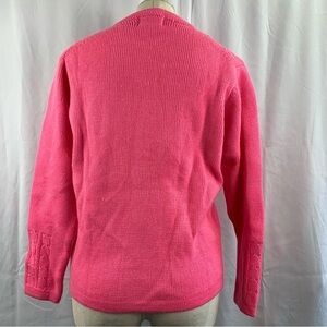 Beautiful hot pink knit cardigan with covered buttons, two front pockets, and a textured detail on the sleeves.