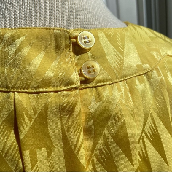 A fabulous piece of 1980s awesomeness. Features dolman type sleeves, shoulder pads for structure, a wide belt at the waist and 100% polyester satiny fabric. The dress is pleated and has a tropical foliage pattern whose sheen is brought out by sunlight. The two first and last three pictures give a better idea of the item's actual colour.