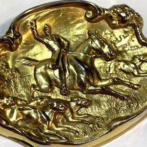 Vintage hunting scene brooch/pin. Beautiful details depicting a hunter on a horse and hunting dogs.