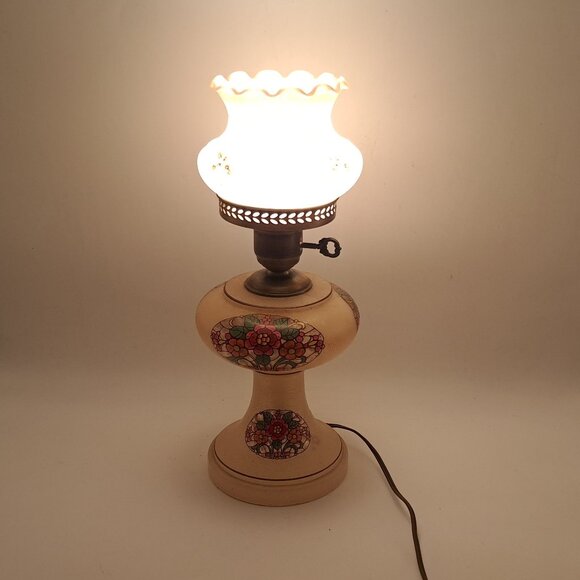 A vintage glass table lamp with brass fixtures, of a style known as a "Hurricane Lamp." It may have once been an oil or candle lamp that was turned into an electric lamp, I can find no makers' marks on the lamp. The body is beige with stained glass flowers (note that it is real stained glass and not the more modern overlays we sometimes find). The glass shade is white with flowers bordered by brown grass. There are 2 lights; 1 turn of the switch turns the bottom one on, 2 turns the top on and 3 turns both on. Note that the top bulb is not included.