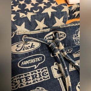 Super cool adjustable denim backpack with tons of Hysteric designs all over