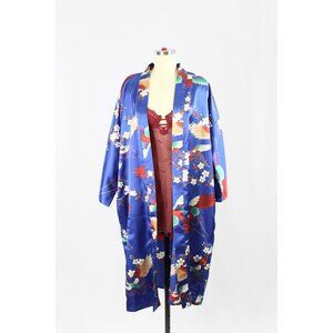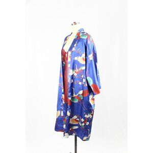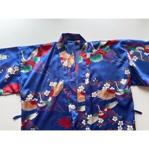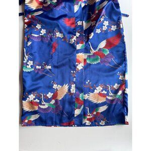 Vintage ICHIBAN Blue Oriental Floral Crane Print Satin Kimono Robe, One Size