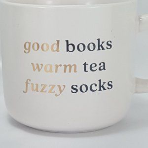 Tags: Indigo Mug Teacup Statement Quote Graphic Good Books Warm Tea Fuzzy Socks White Black Gold Vintage, Retro, Collectible