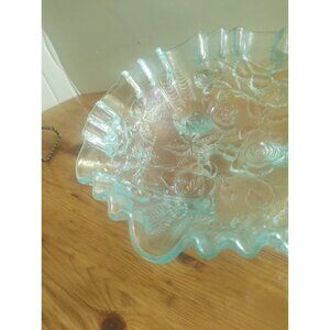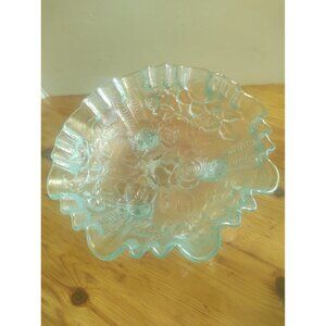 This is an Imperial Glass Company Ice Blue Carnival 3 Footed Roses Bowl. It's a vintage piece of carnival glass known for its iridescent sheen and pressed patterns, specifically the rose motif. This particular bowl is ice blue, which is considered a rare and valuable color for carnival glass. The bowl features three small feet, and a ruffled rim. Imperial Glass Company produced carnival glass from about 1908 until they closed in 1984. The company used the "Iron Cross" mark on some pieces