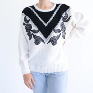 Vintage Impromptu White & Black Floral Knit Crewneck Sweater Size 38