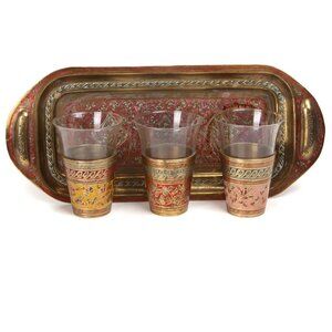 Set of 4 items: 1 brass tray and brass/glass 3 cups