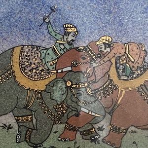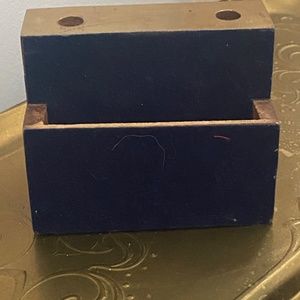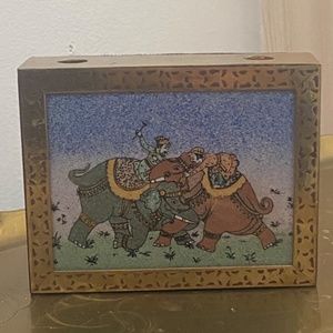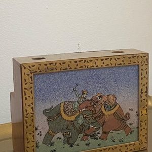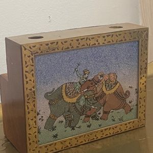 Vintage Indian artwork, wood & brass, pen & notepad holder