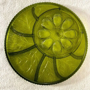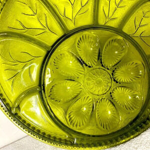 Vintage Indiana Avocado Green Glass Round Relish Deviled Egg Tray Platter