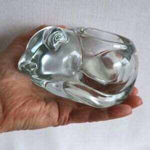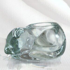Vintage votive clear candle holder in the shape of a curled-up cat.