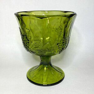 A green glass dish with raised grape bunches with leaves in the design. Pedestal base. Sturdy. Good vintage condition, no chips, cracks. Approximately 6 1/4" H x 5" D.