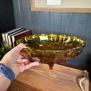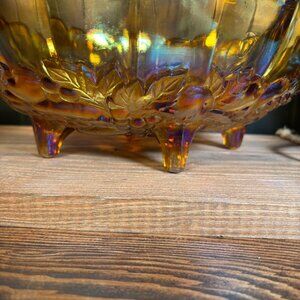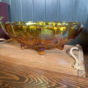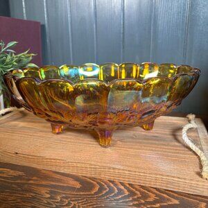 This vintage Indiana Glass Harvest Grapes footed oval fruit bowl features a rich amber-to-gold iridescent pressed carnival glass finish with a dramatic scalloped edge and deeply molded grapes and vine motif around the body. The bowl stands on a distinctive four-footed base, giving it elegant lift and strong visual presence. Estimated era: 1960s–1970s. A beautiful statement piece for fruit display, holiday serving, or collectible Indiana Glass décor.