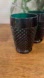A vintage set of six Indiana Glass Tiara Cameo tumblers in striking black amethyst glass. These heavy pressed glass tumblers feature a diamond point textured pattern with smooth banded rims and a starburst base. When held to the light, they reveal a deep green hue. A standout addition to any mid-century or retro glassware collection.