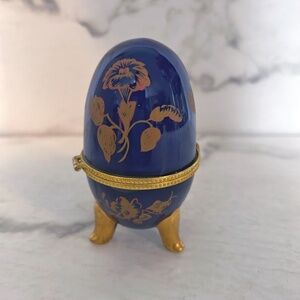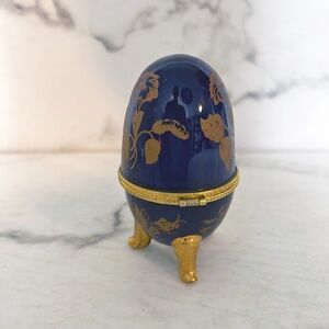 Footed egg trinket / jewellery box, blue with gold footed base, hinge opening, gold trim