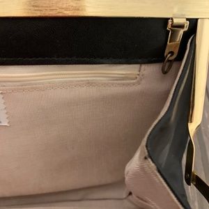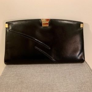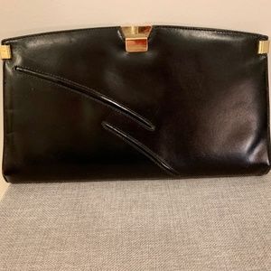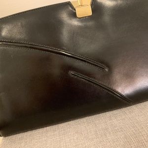 I love this purse, it’s so well made and is in excellent vintage condition. Purse is black leather with brass coloured twist clasp and side tabs in excellent shape. Two large open and one small zippered inner compartments. Beautifully clean inside. Has brass loops inside to affix a strap but no strap is included. I took a lot of pictures 👛❤️