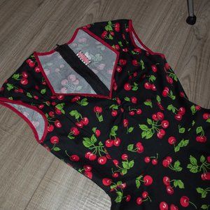 Cotton spandex blend swing dress from Pinup Couture. Black background with cherry print and red trim along the neckline. Ruching details under the bust and where the sleeves meet the bodice.