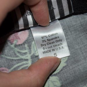 Sweetheart neckline, capped sleeves, and A-line skirt. Fitted bodice. Material has some stretch. There is a zipper down the back for changing in and out, fits more like an XS -- may be difficult to step into if you have a large behind/wide hips.