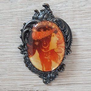 Vintage-inspired, handmade metal brooch with glass inlay of a painting of a woman in reds and oranges.