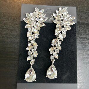 Vintage-inspired clip-on chandelier earrings with cascading rhinestones, lightweight, sparkling design, perfect for weddings, bridesmaids, formal events, or prom