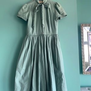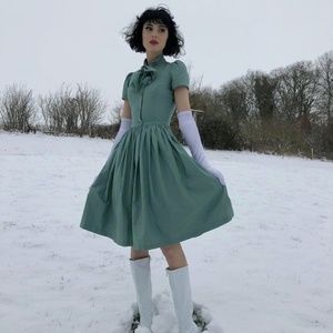 A vintage inspired teal cotton day dress form 'Hearts and found'. She has a lovely full skirt with a darling tied neck bow. And the best part, pockets!