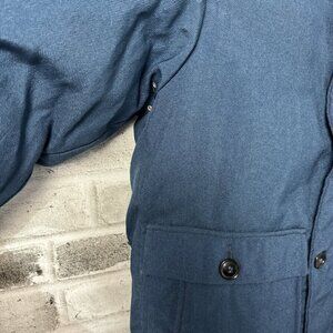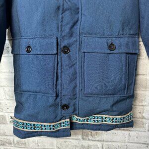 Stay warm and stylish with this vintage Inuit parka coat. Made with a nylon outer shell and down insulation material, this mid-length coat is perfect for winter and features a high collar, fur trim hood, button and quilted accents, sherpa lined pockets and a zipper button closure. The blue canvas fabric type adds a touch of bohemian and western flair, while the water-resistant and wind-resistant features make it perfect for travel, casual wear, and workwear. The coat also includes inner pockets, weathergear technology, and thermal insulation to keep you cozy during the cold season. This jacket is a women's size small and is designed with a relaxed fit.