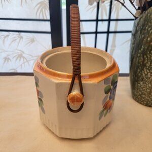 Vintage Iridescent Floral Lustre Ware Biscuit Barrel Cookie Jar w/ Rattan Handle