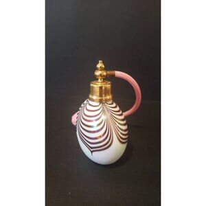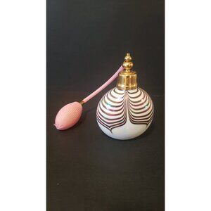 Vintage White Atomizer. Purple Feather Pattern. Decorative, artful piece. Very good condition. Perfect for displaying. No damage to this piece. Im not sure the material. Feels like a resin. 4 x 5 inches
